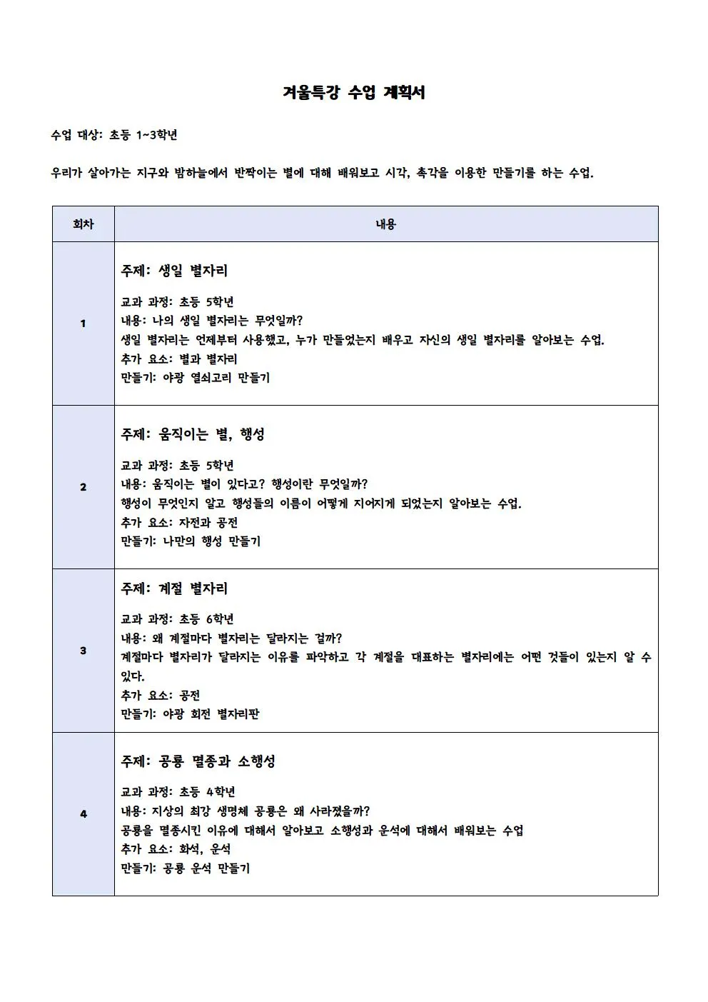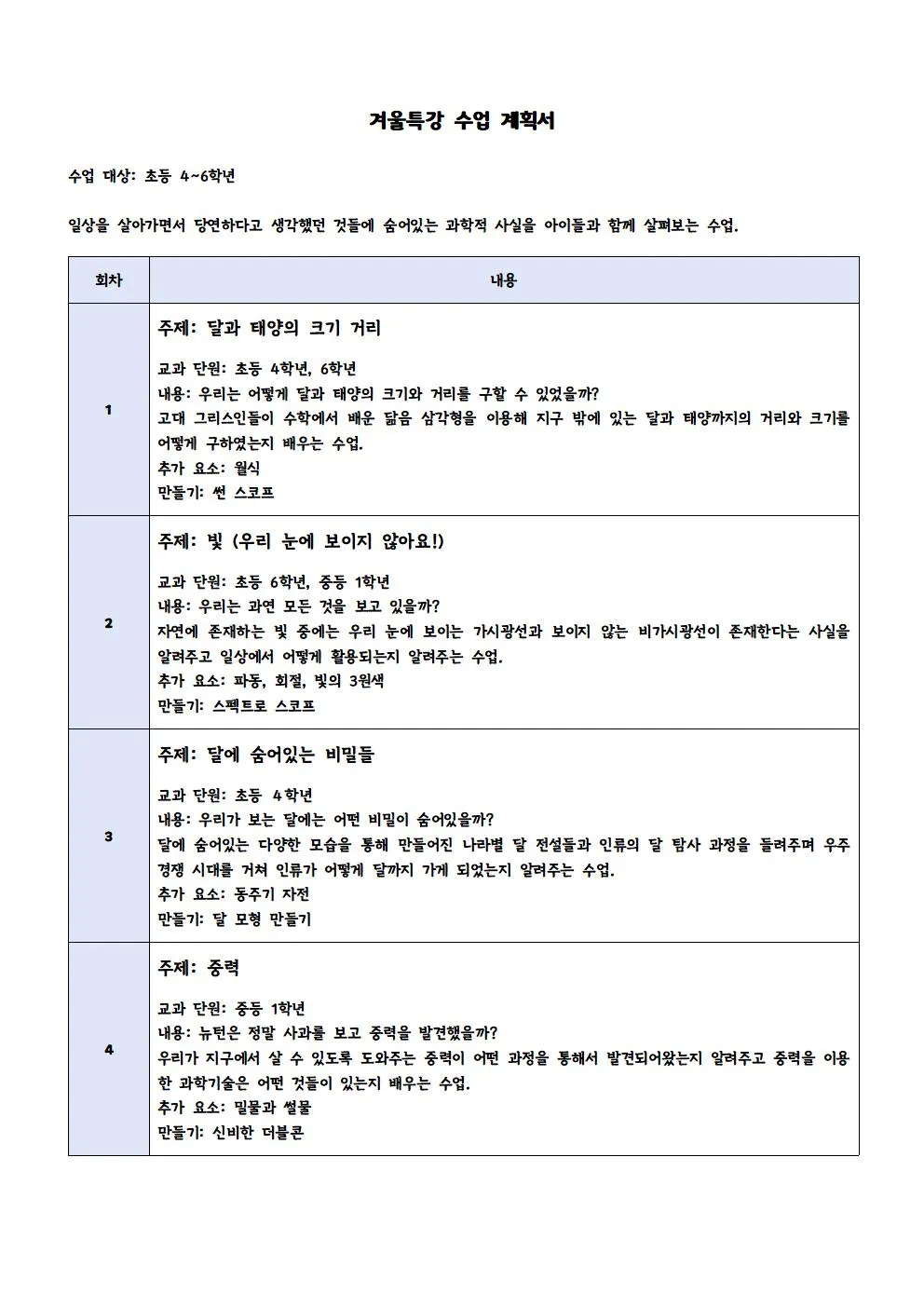 시수 : 매주 토요일 오전 9시 30분~11시 , 4회 완성