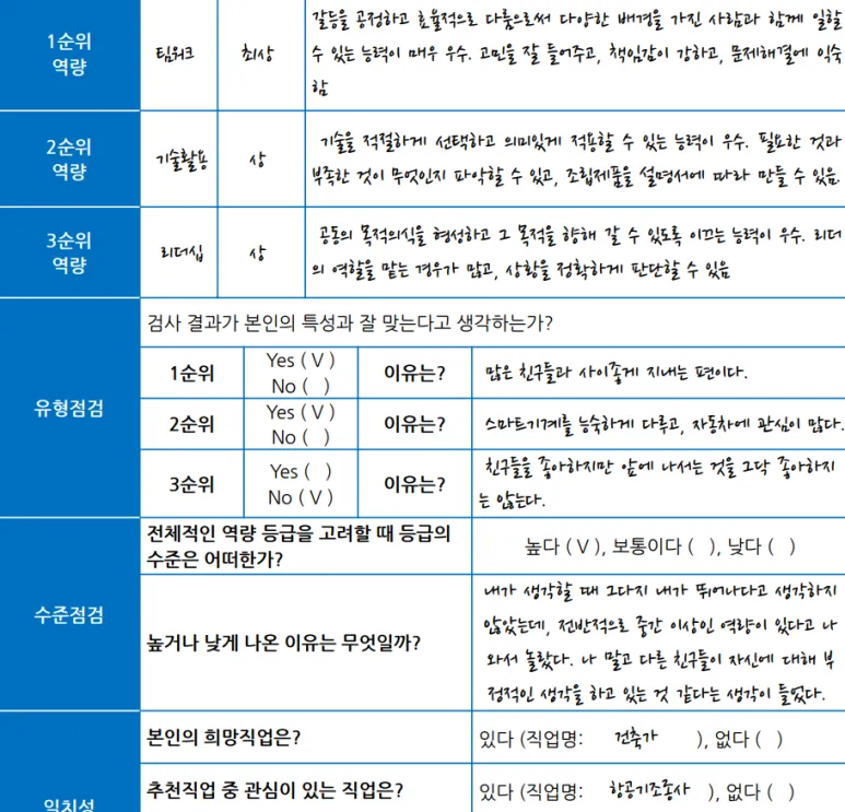 이건 학생들이 작성한 보고서의 예시입니다. 학생들은 CCI검사를 통해 알게된 본인의 역량을 보고서로 정리해 보면서, 여러 가지 생각을 합니다.