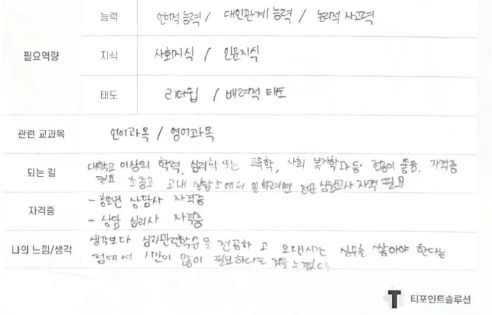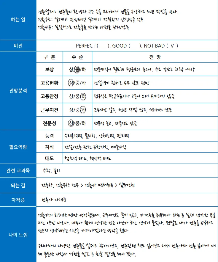 직업군, 학과, 학교의 선택까지 끝나면, 학과 정보에 대한 것도 찾아봅니다. 3시간의 캠프동안 총 3장의 보고서를 작성했고, 직업에 대한 궁금증은 실제로 검색도 해보고, 가고싶은 학교, 학과 홈페이지를 찾아서 들어가보기도 했답니다.