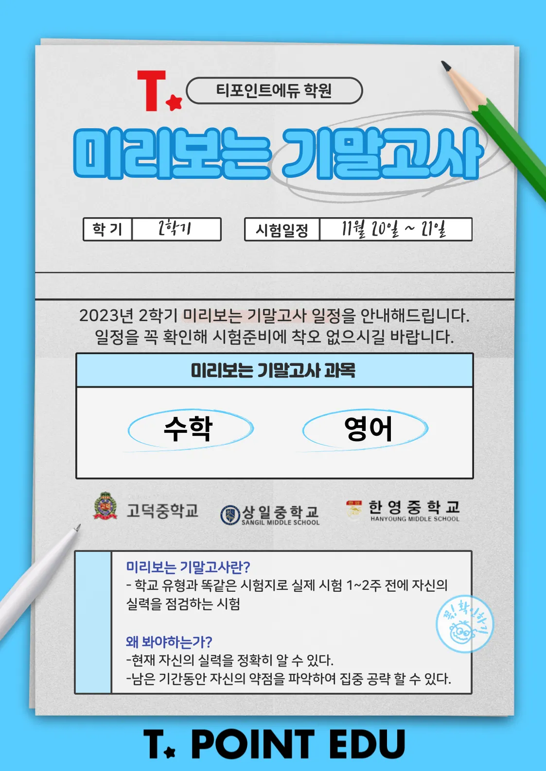 이번 기말고사에도 역시나! 티포인트에듀만의 자랑인 ‘미리보는 기말고사’를 실시합니다!