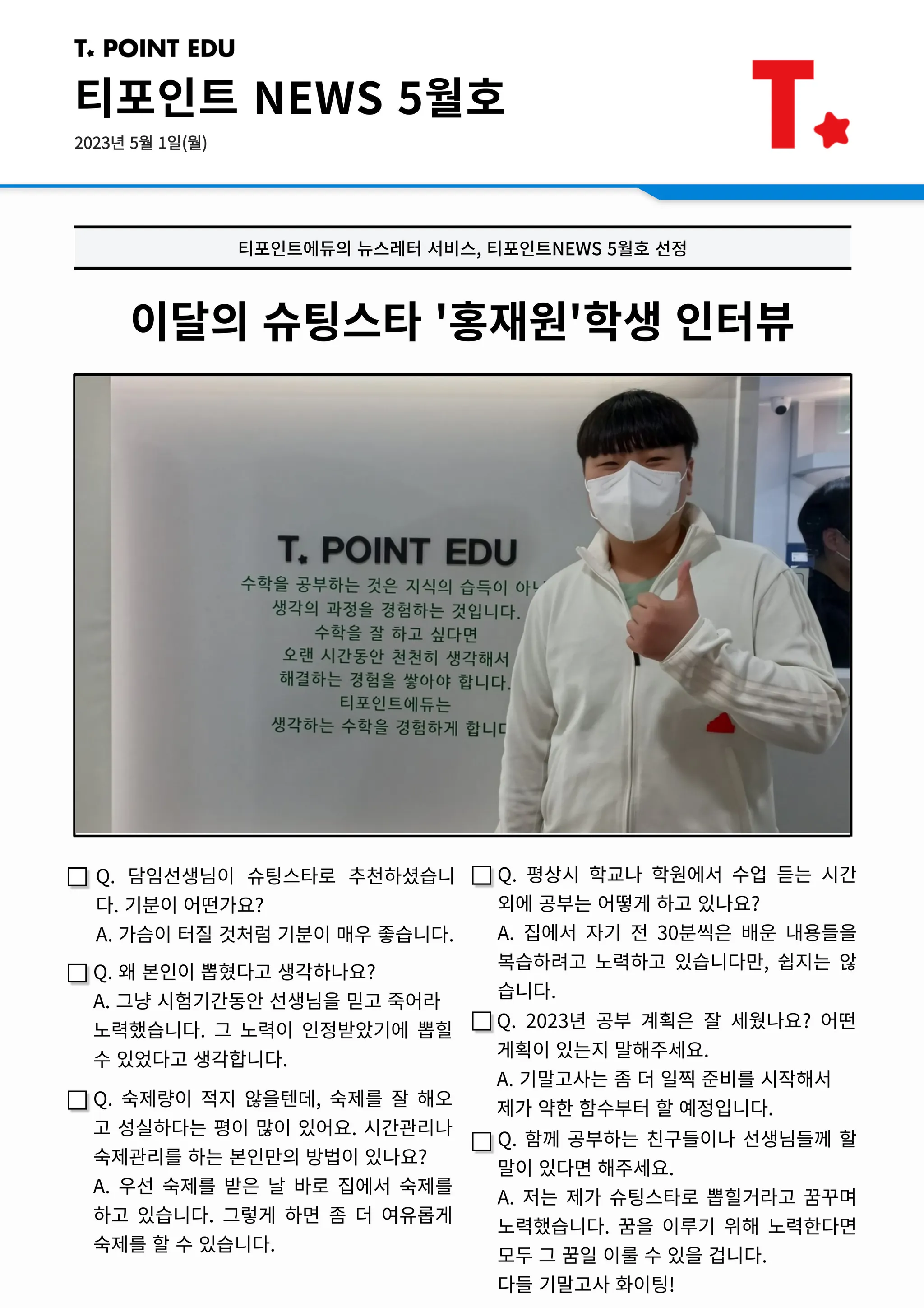 2023년 티포인트 5월호 이달의 슈팅스타에 홍재원 학생이 선정됐습니다!